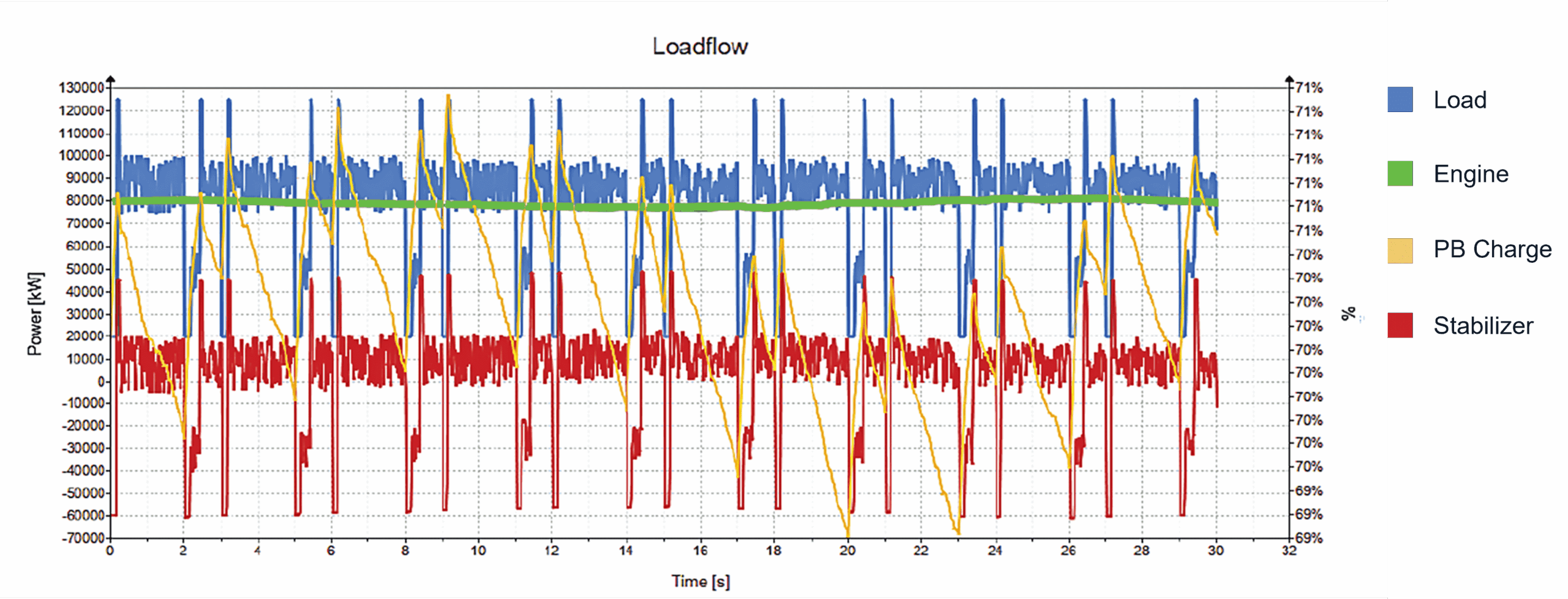 The kinetic energy stabilizer (red) rapidly injects and absorbs power in sub-millisecond bursts to buffer the volatile AI-driven load (blue), while maintaining frequency stability. As a result, the engines (green) run steadily at their preferred average operating point while maintaining voltage and frequency within ±1% even through extreme AI-driven load st