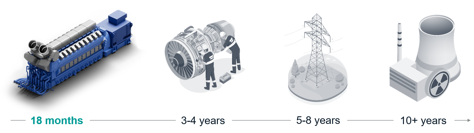 Grid connections for new AI-class data centres can take 6+ years to secure. Turbine-based islanded plants aren’t far behind, often requiring 3 – 4 years to build and offering less agility in handling fast-ramping load profiles.